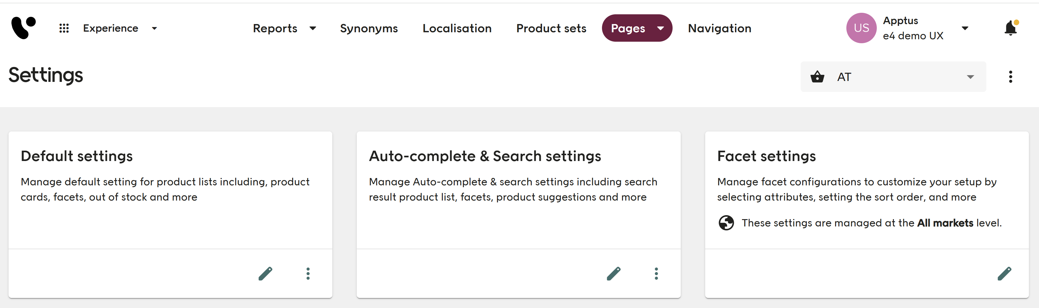 In the Settings tab you can manage default settings for all product lists, and page settings for category and landing pages, as well as search and autocomplete settings. Overrides for specific product listings or page properties on individual pages are managed in the Pages tab.