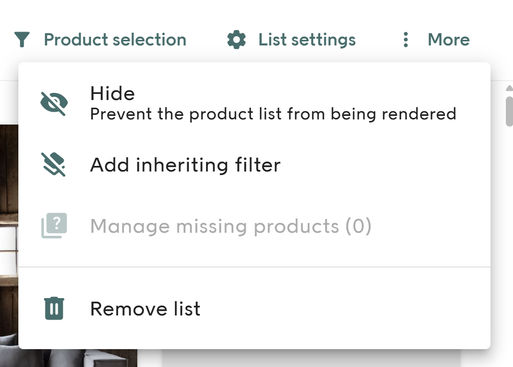 Use the More option if you want to hide the product list temporarily. Here you can also add an inheriting filter, Manage missing products and permanently delete the list from the page.